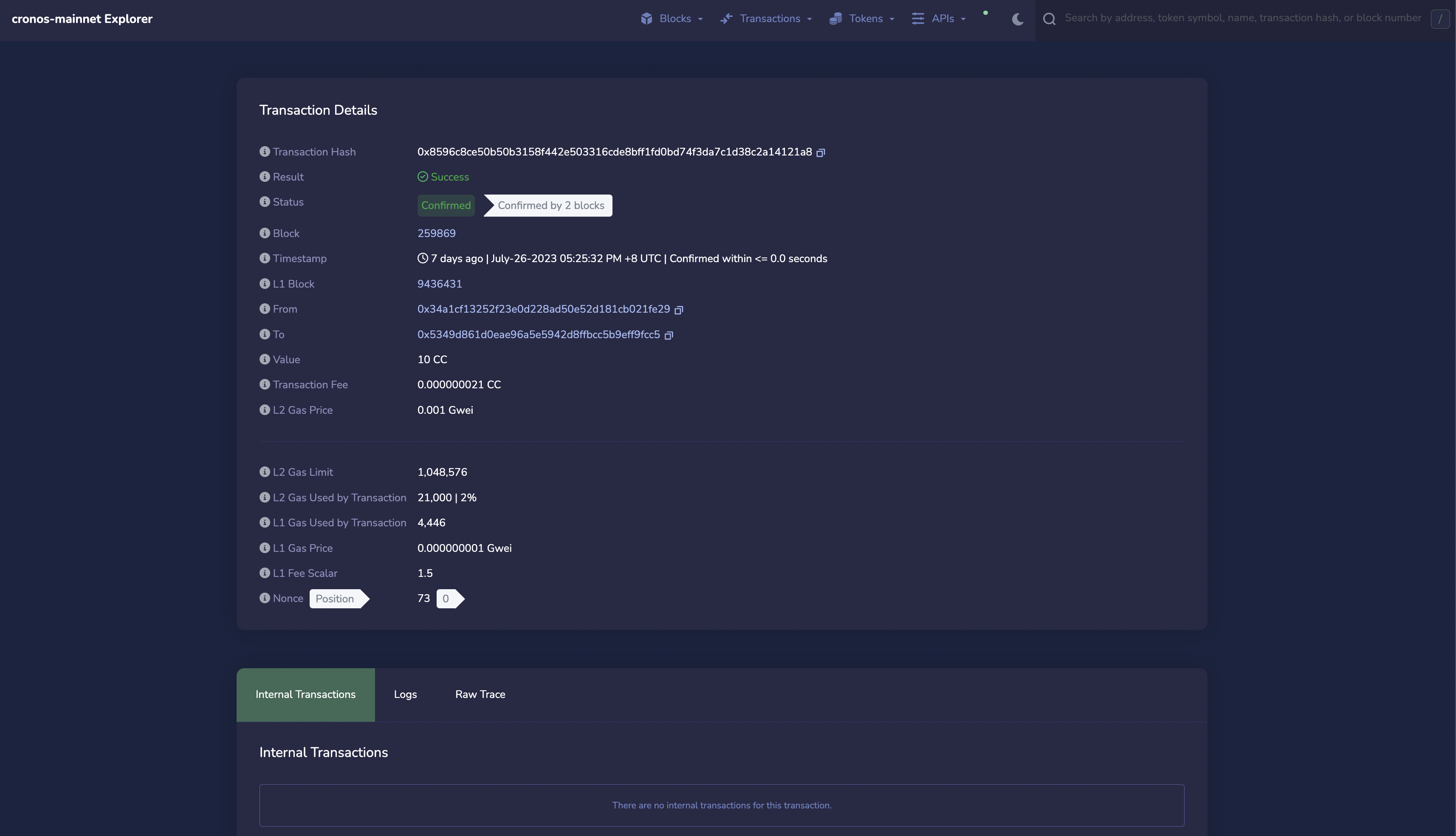 4. When you send transactions via Metamask on the Caldera explorer, you can view these transactions using the caldera explorer: <https://cronos-testnet.calderaexplorer.xyz/>.\