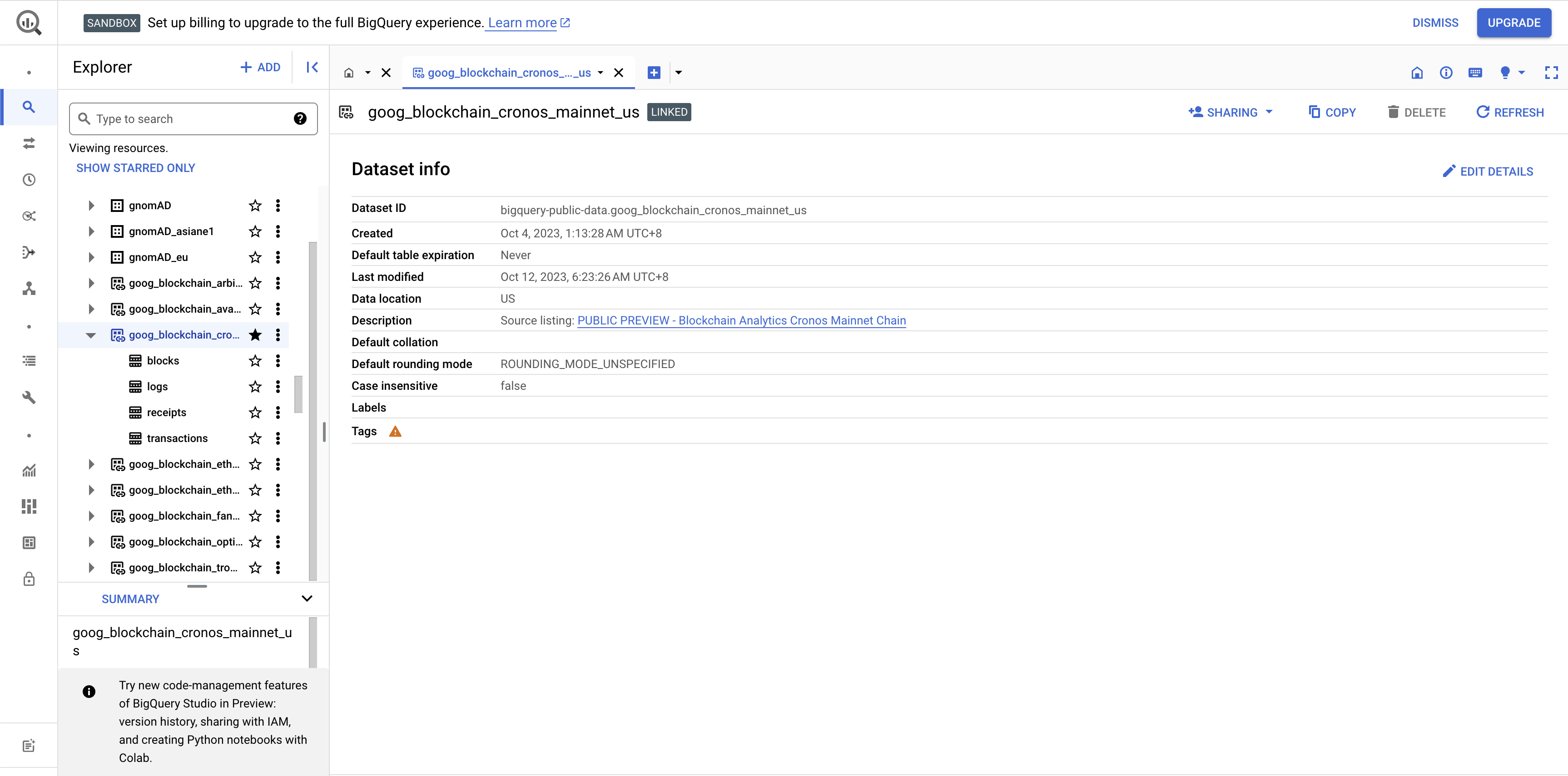 1. [Go to Cronos dataset](https://console.cloud.google.com/marketplace/product/bigquery-public-data/blockchain-analytics-cronos-mainnet-us?_ga=2.57494312.344001667.1705466080-1066618470.1698651784&_gac=1.157920072.1705465933.CjwKCAiA75itBhA6EiwAkho9e8myknN2EhHAyk2F9H-eciNzXDhip1AUtZ6GiBaCllmrfHni5MMy3BoCKroQAvD_BwE) and click on one of the [samples](https://console.cloud.google.com/bigquery?sq=650023896125:07dd7c4b273c45639c8f38983b9b7de0).